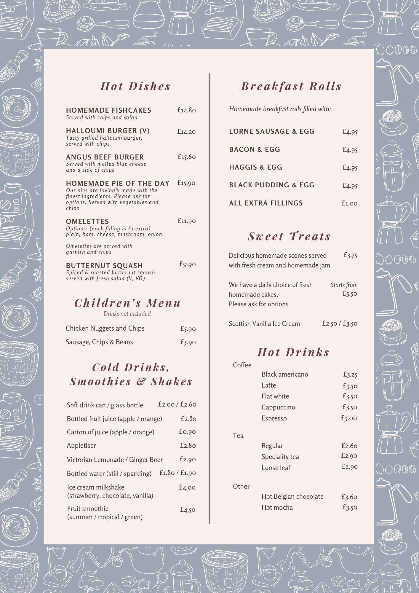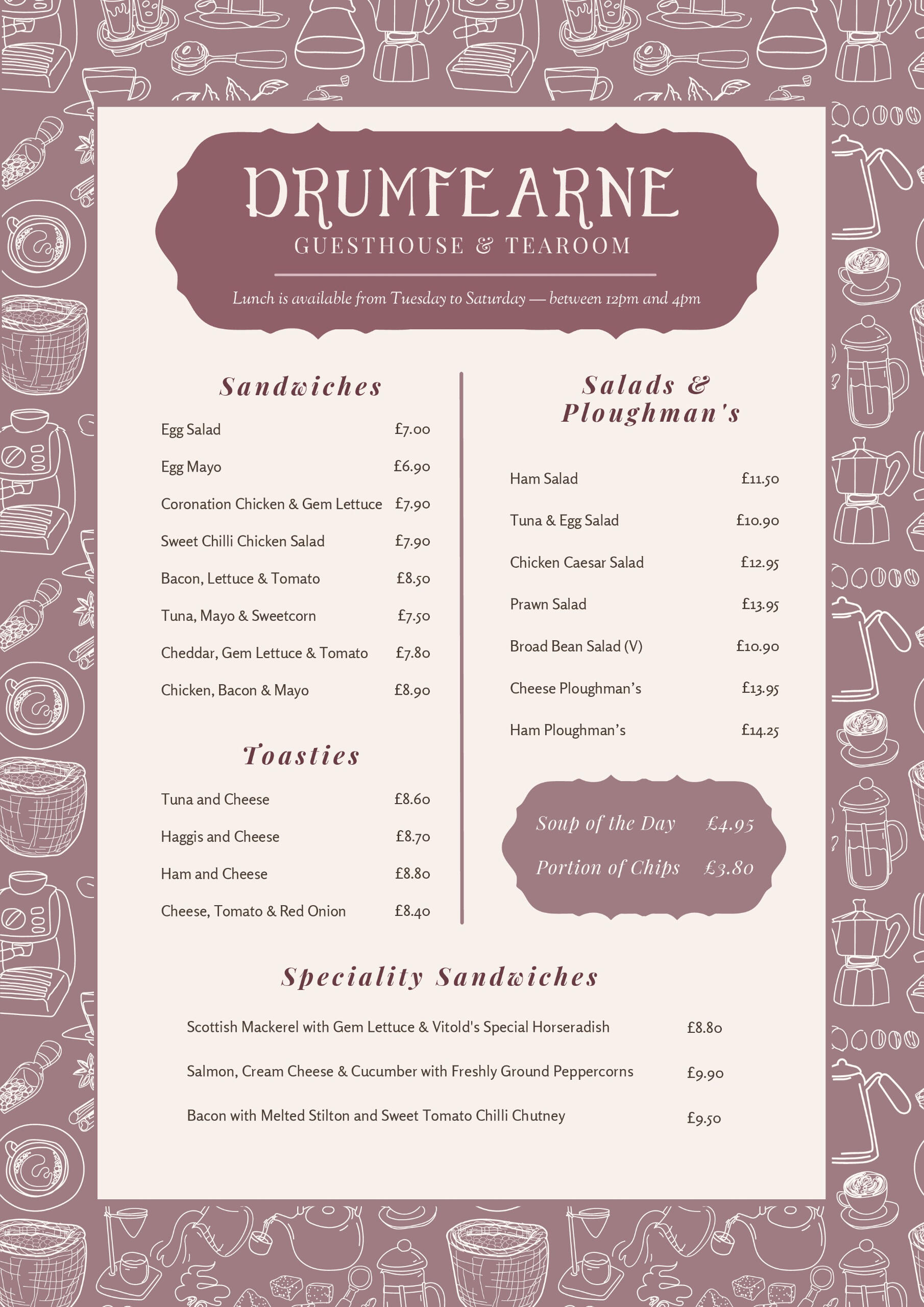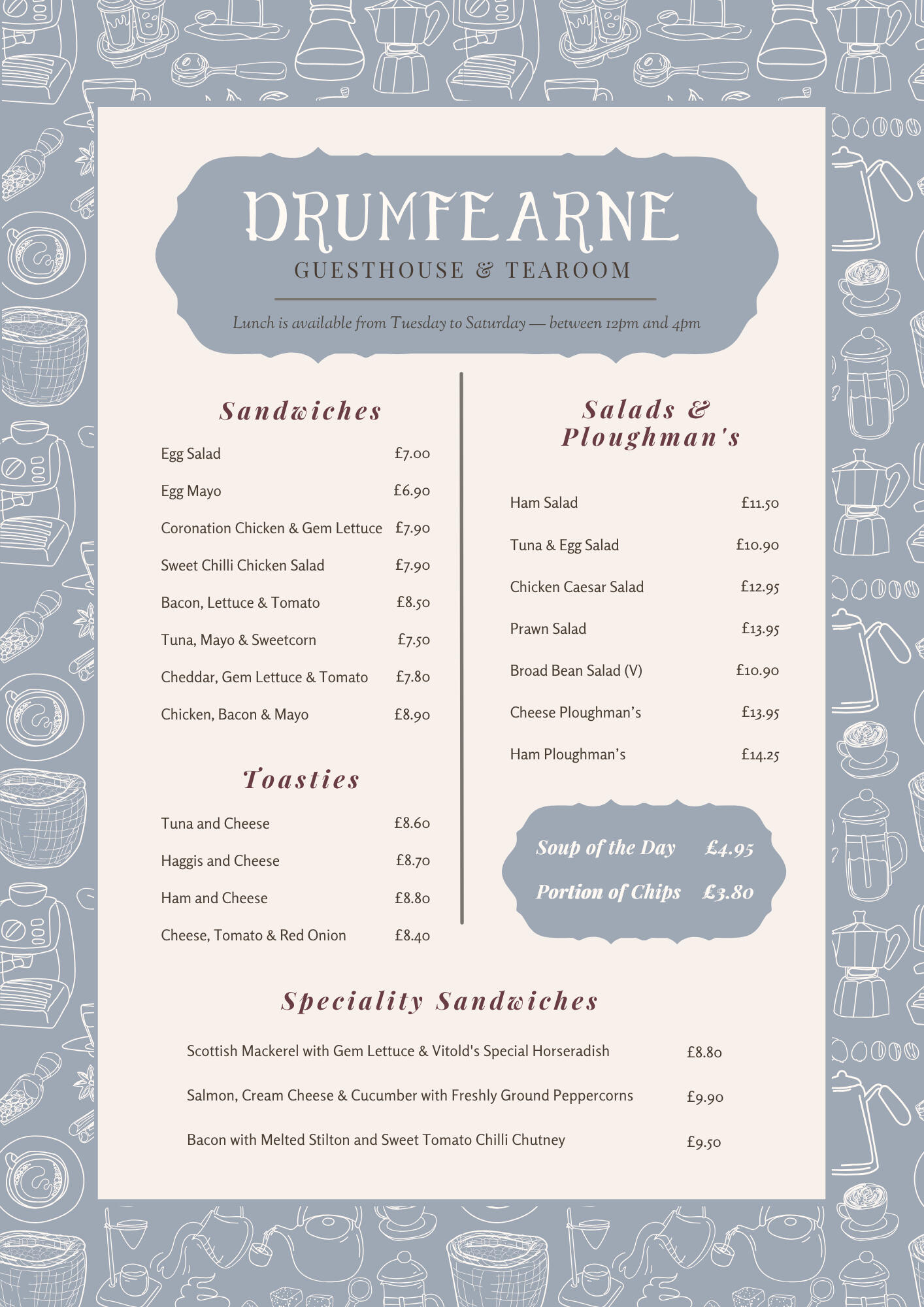 Our wee tearoom looks out to the coast and serves fresh, home-cooked lunches, great coffee, and plenty of tea. The menu’s relaxed and hearty, with something for everyone — including vegetarian, vegan, and gluten-free options.Everything is made in-house, including our home-baked bread. We use our own garden produce whenever we can — herbs, salads, tomatoes, cucumbers, and even eggs from our hens when they’re laying!