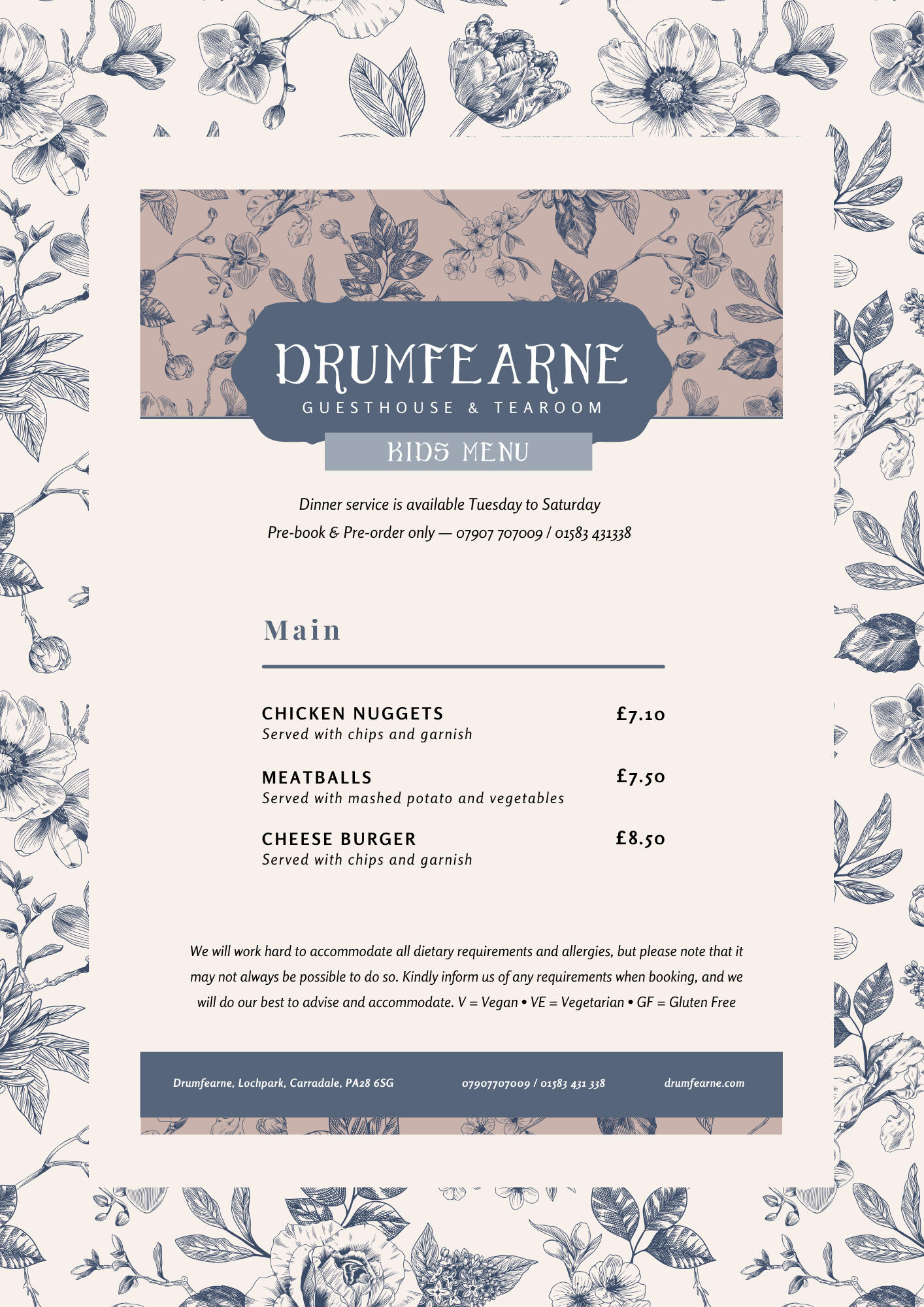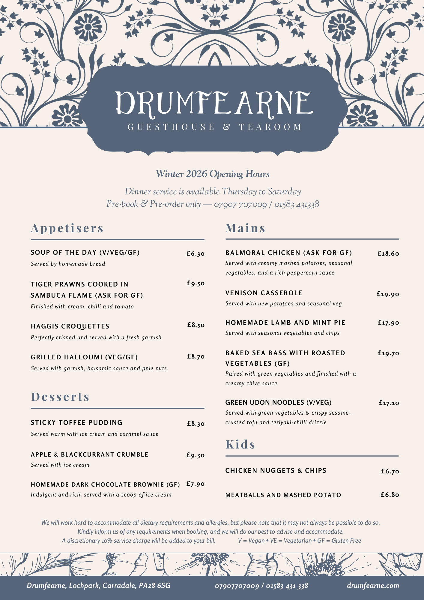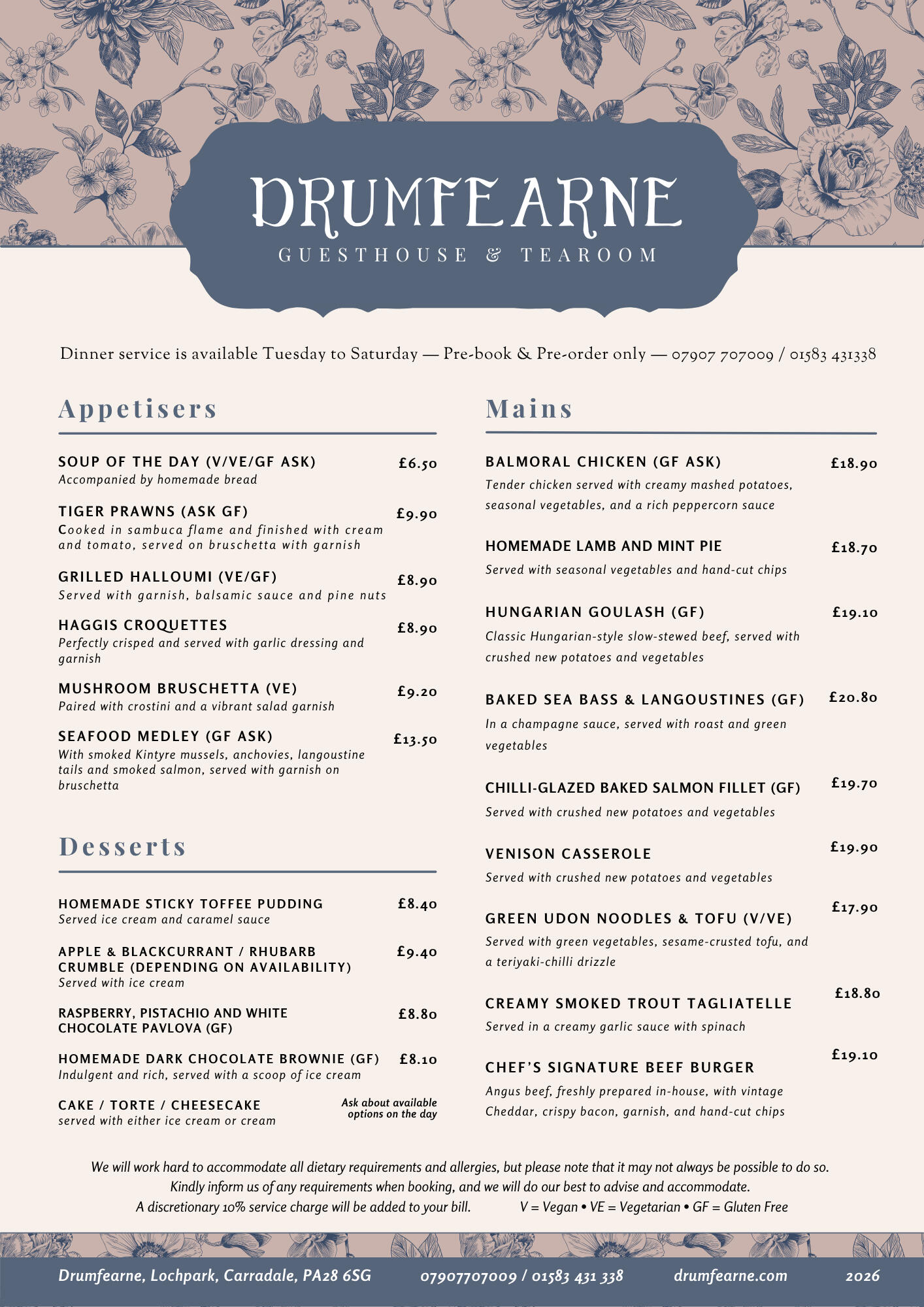 Served in our intimate tearoom, our 2026 seasonal menu offers a luxurious yet welcoming dining experience. Expect beautifully prepared dishes featuring a variety of meats, fresh fish, and thoughtful vegetarian and vegan options — all crafted with care and attention to detail. We use our own garden produce wherever possible, from herbs and salads to tomatoes and eggs when in season.We welcome guests to bring a bottle to enjoy with their meal, but we kindly ask that you enjoy your drinks responsibly and in moderation.Please inform us of any dietary requirements or allergies when booking.
